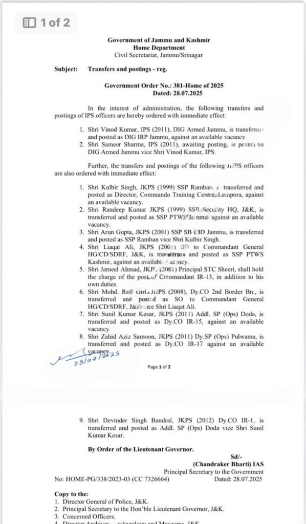 JAMMU, July 28:Lieutenant Governor Jammu and Kashmir Manoj Sinha toady ordered transfers and postings of DIG , SSP Rank Police Officers ; Sameer Sharma DIG Armed , Arun Gupta SSP Ramban.