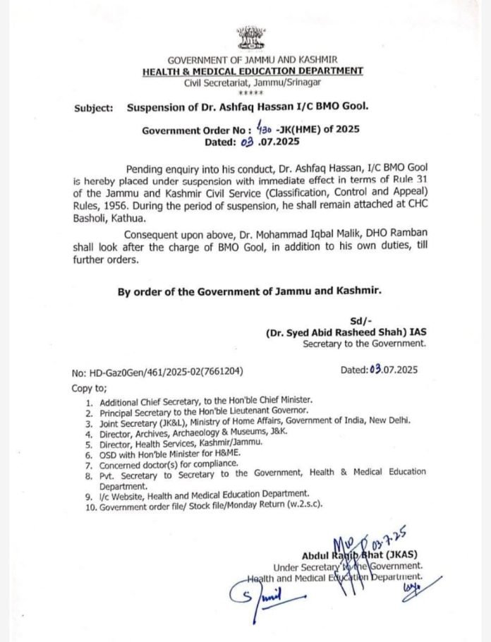 Jammu, July 3: The Health and Medical Education Department has suspended Dr. Ashfaq Hassan, Incharge Block Medical Officer (BMO) Gool, pending an inquiry into his conduct.