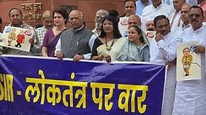 Ahead of the day’s proceedings in Parliament, Kharge, Priyanka Gandhi Vadra, DMK’s TR Baalu and A Raja, as well as other opposition MPs raised slogans and protested against the Special Intensive Revision (SIR) of electoral rolls in Bihar.